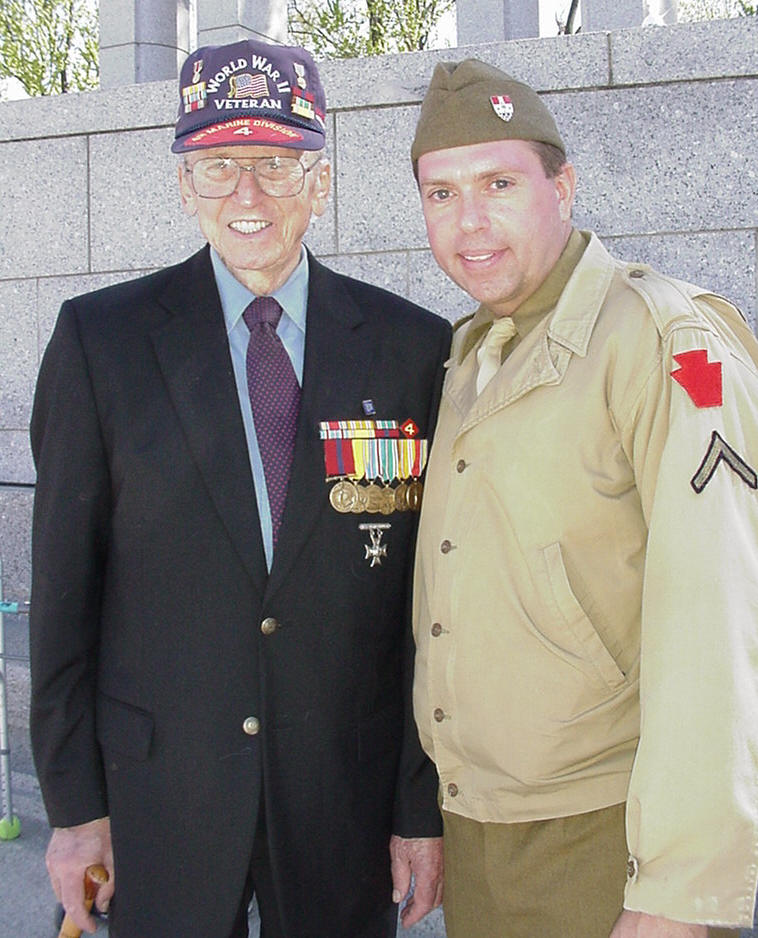 63 years later, Bud Hansen was now making more noise with Uncle John, this time on Memorial Day, 2008, their last and unforgettable meeting at the WWII Memorial. Personally, this was a day I will always remember as Johnnie and Bud again shared many a laugh, smile and joke. The smiles on their faces placed a permanent mark upon my heart as the two held an American Flag, Army and Marines, celebrating their hard fought victory in WWII. As John passed into history in November of 2009, I called Bud and Linda to let them know the sad news. We stayed in touch since then with cards and the occasional phone call, but the times in which these great men were boys again at the Memorial are moments I will always remember. Bud passed silently away on March 25th of 2011, yet I can still hear my heart beating strong in thought for those two heroes like the steady and true drumming that leads a patriotic tune. Drum up a song for me Bud and Johnnie will sing along. We will all hear it down here...