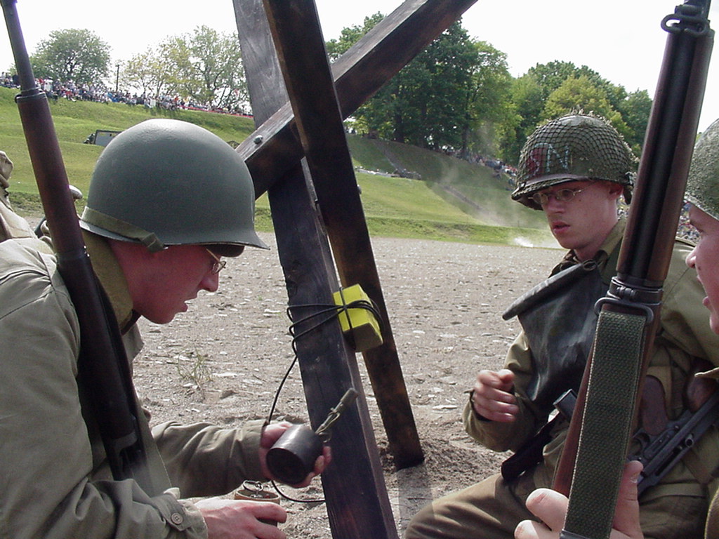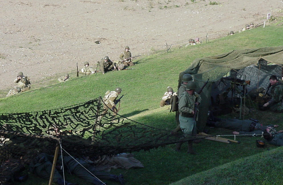 Ironically it was a flying object that killed my uncle on D-Day as well. The pyro burst moments before seem to set the stage for my own demise. Just prior to my uncle’s Amin’s final moments, a huge explosion sent a jeep high into the air. Returning to earth, the vehicle landed directly upon my Great Uncle killing him instantly. Amin Isbir is buried in France overlooking the sands of Omaha Beach where he died so others can be free. In 2006, my cousin Jim Ameen is making the trip from Florida to attend this years’ event. Jim and I met ironically at a WWII event. He recognized Amin’s brother John whose photo I had in a family album. This amazing story of our Uncle Amin’s death was the catalyst of each of us becoming a WWII re-enactor. Jim and I met in our early childhood, but had not seen each other for well over 30 years. We were brought together again due our mutual interest in honoring our family by a chance meeting in Miami Beach. But that’s another story!