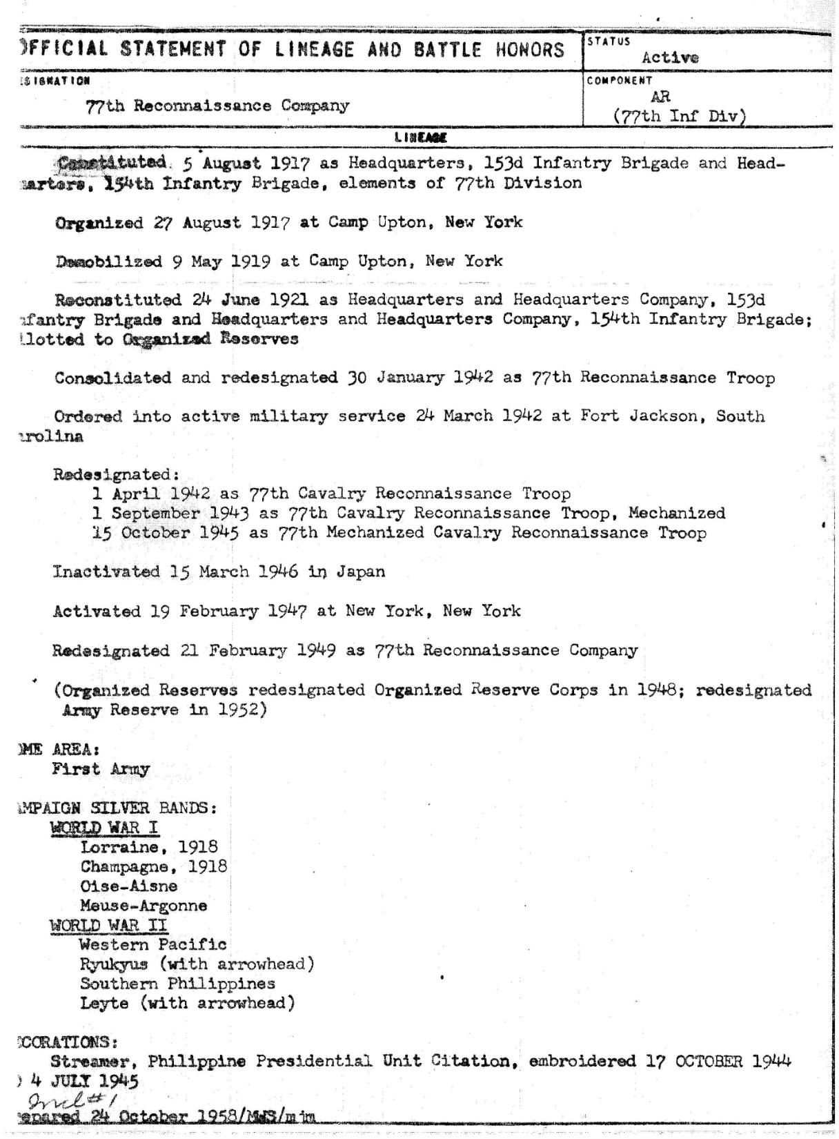 Battle Lineage of the 77th Reconnaissance Troop
